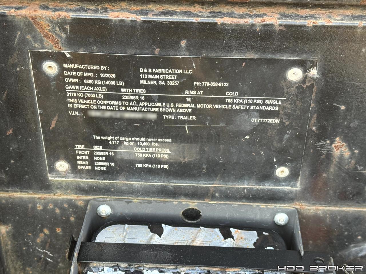 2020 B&B Fabrication LLC CT7T172EDW Equipment Trailer.